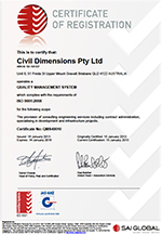 We work with a diverse range of clients and aim to provide the same high quality of service for all. To achieve this Civil Dimensions has established a Quality System based on the requirements of ISO 9001:2008 with 3rd Party certification from SAI Global.